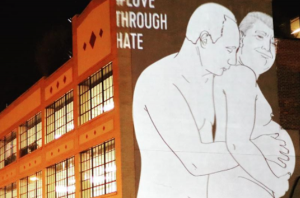 Ինչպես նշում է The Huffinghton Post-ը, «Ատելության միջով դեպի սեր» (Love Through Hate) խորագրով պրոյեկցիայում մինչև գոտկատեղը մերկ Պուտինը հետևից փաթաթվել է հղի Թրամփին: