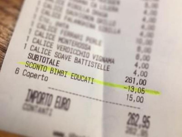 Իտալիայում ռեստորանատերը հաճախորդներին զեղչ է առաջարկում «դաստիարակված երեխայի» համար: Ըստ UPI-ի՝ Անտոնիո Ֆերրարին որոշել է 5% զեղչ տրամադրել հաճախորդներին «bimbi educati»՝ հարգալից երեխայի համար: