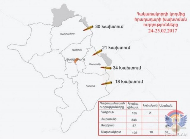 Փետրվարի 25-ին՝ ժամը 03:00-ի և 04:00-ի սահմաններում, շփման գծի միանգամից երկու` հարավարևելյան (Մարտունի) և արևելյան (Ակնա) ուղղություններով հակառակորդը, օգտագործելով ականազերծման համապատասխան տեխնիկա և հատուկ միջոցներ, ձեռնարկել է հարձակման փորձ: ՊԲ առաջաջապահ ստորաբաժանումները, նաև շնորհիվ տեսադիտարկման սարքավորումների, երկու ուղղություններում էլ ժամանակին հավաստանշել են ադրբեջանական ստորաբաժանումների առաջխաղացումը և կորուստներ պատճառելով հետ շպրտել ելման դիրքեր: Բանակի առաջապահ ուժերի պատասխան գործողությունների արդյունքում հակառակորդը տվել է զոհեր և վիրավորներ: Մի քանի դիակ գտնվում է չեզոք գոտում: Հայկական կողմը զոհեր ու վիրավորներ չունի: