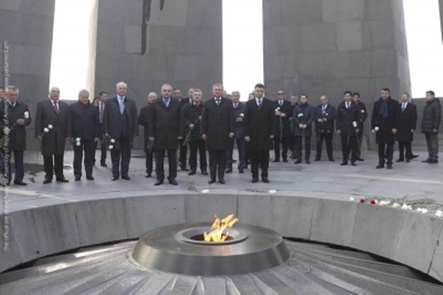 Պաշտոնական այցով Երեւանում գտնվող ՌԴ ԴԺ Պետական դումայի նախագահ Վյաչեսլավ Վոլոդինի գլխավորած պատվիրակությունը ՀՀ ԱԺ նախագահի տեղակալ Էդուարդ Շարմազանովի, ԱԺ արտաքին հարաբերությունների մշտական հանձնաժողովի նախագահ Արտակ Զաքարյանի, ԱԺ պատգամավորներ Վոլոդյա Բադալյանի, Ռուբիկ Հակոբյանի, ՌԴ-ում ՀՀ դեսպան Օլեգ Եսայանի ուղեկցությամբ մարտի 3-ին այցելել է Ծիծեռնակաբերդի հուշահամալիր։ ՌԴ ԴԺ Պետական դումայի նախագահ Վյաչեսլավ Վոլոդինը եւ ՌԴ ԴԺ Պետական դումայի պատգամավորները Ռուսաստանի խորհրդարանի անունից ծաղկեպսակ են դրել Հայոց ցեղասպանության զոհերի հուշարձանին, ծաղիկներ խոնարհել անմար կրակի մոտ եւ լռությամբ ու խոնարհումով հարգել Սուրբ նահատակների հիշատակը։ Ռուս խորհրդարանականները եղել են Հայոց ցեղասպանության թանգարան- ինստիտուտում, ծանոթացել Մեծ եղեռնը հավաստող փաստաթղթերին, դիտել ցուցանմուշները։ Պետական դումայի նախագահ Վյաչեսլավ Վոլոդինը նշել է. «Եթե հիշենք եւ չմոռանանք 1915 թվականին տեղի ունեցածը, եթե հիշենք ու չմոռանանք 1941 թվականին տեղի ունեցածը, ապա ցեղասպանությունները չեն կրկնվի»։ © shamshyan.com http://shamshyan.com/hy/article/2017/03/03/1060498/