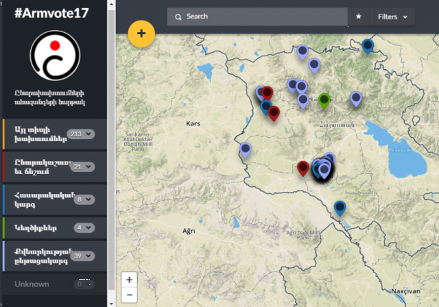 Կարմիր գույնով նշված են ընտրակաշառքների և ճնշումների դեպքերը, կապույտով՝ հասարակական կարգի խախտումները, կանաչով՝ կեղծիքները, մանուշակագույնով՝ քվեարկության կարգի խախտումները, նարնջագույնով՝ այլ խախտումները։