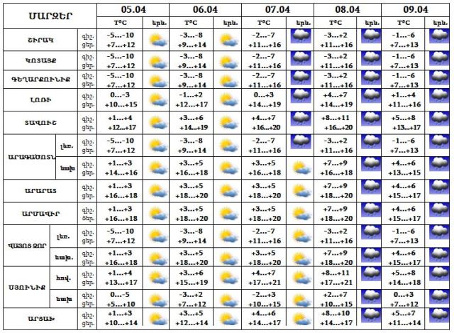 Ապրիլի 5-6-ը սպասվում է առանց տեղումների եղանակ: Ապրիլի 7-ին՝ օրվա երկրորդ կեսին, առանձին շրջաններում, ապրիլի 8-9-ը շրջանների զգալի մասում սպասվում է անձրև: