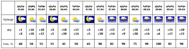 Ապրիլի 5-6-ը սպասվում է առանց տեղումների եղանակ: Ապրիլի 7-ին՝ երեկոյան ժամերին, հնարավոր է, ապրիլի 8-9-ը սպասվում է անձրև: