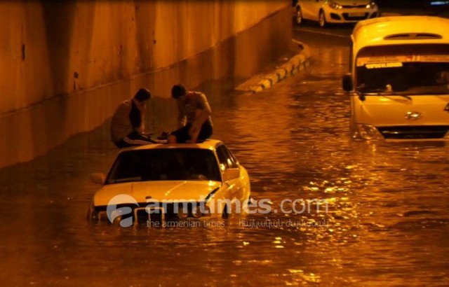 Ուժեղ կարկուտի հետեւանքով փողոցները ջրով են լցվել եւ բարդացրել երթեւեկությունոը: Մեքենաները գրեթե կիսով չափ ջրի մեջ են: Այս լուսանկարներում մեքենաները փորձում են անցնել Մաշտոցի պողոտայի սկզբնամասում գտնվող թունելով: