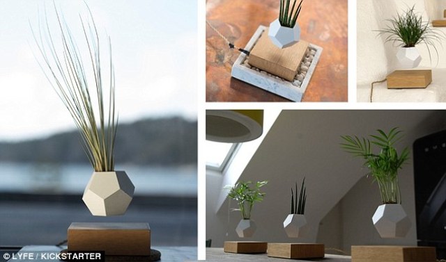 Մագնիսական լևիտացիայի շնորհիվ օդում «ճախրող» ծաղկամանը գտնվում է ընկուզենու փայտից պատրաստված տախտակի վերևում:
