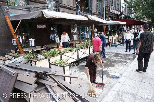 Ըստ այդմ, աշխատակազմի քաղաքաշինության և հողի վերահսկողության, առևտրի և սպասարկումների վարչությունները, հասարակական կարգի պահպանության ծառայության աշխատակիցների աջակցությամբ արդեն այսօր նախաձեռնել են մասնավորապես մայրաքաղաքի Թումանյան փողոցի` Հյուսիսային պողոտայի հատման մասից մինչև Աբովյան փողոցի հատման մասն ընկած հատվածում առկա բացօթյա սրճարանների սահմանազատման աշխատանքները: Մայթի կեսից ավելին սրճարանների սեղան-աթոռներով կամ առևտրի օբյեկտների սառնարաններով զբաղեցված հատվածներում իրականացվում են տարածքների կարգաբերման աշխատանքներ: Սրճարանների և առևտրի օբյեկտների գույքը տեղափոխվում է հատկացված տարածքներ, քանդվում են ծածկերը, մայթերն էլ ազատվում են՝ հետիոտնի անարգել անցուդարձն ապահովելու համար: Այս աշխատանքները կրելու են շարունակական բնույթ է և կիրառվելու են բոլոր այն վայրերում, որտեղ սեզոնային սրճարաններն ու հասարակական սննդի օբյեկտները շահագործող տնտեսվարողները գերազանցել են իրենց գործունեությունը կազմակերպելու համար քաղաքապետարանի կողմից հատկացված տարածքները: