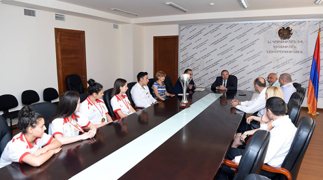 ՀՀ կրթության և գիտության նախարար Լևոն Մկրտչյանն այսօր ընդունել է ՀՀ բասկետբոլի 16 տարեկան աղջիկների հավաքական թիմին, ովքեր հուլիսի 23-31-ը Ջիբրալթարում անցկացված Եվրոպայի C դիվիզիոնի առաջնությանը զբաղեցրել էին 1-ին տեղը։