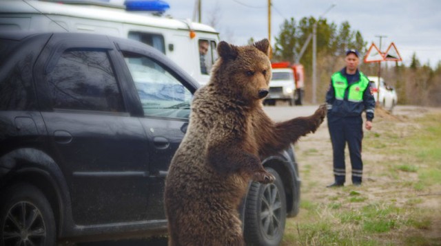 Чтобы отогнать медведя от человека, сотрудник ГИБДД сначала произвел выстрелы в воздух, после чего зверя пришлось застрелить.