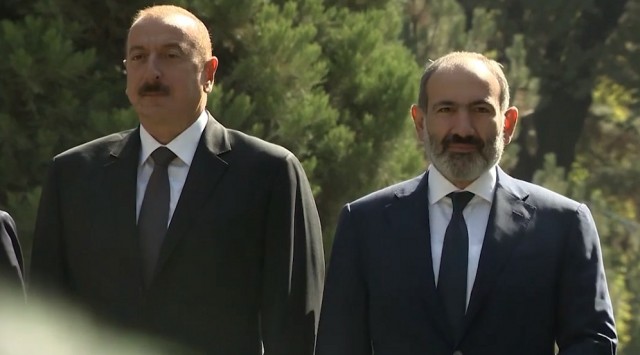 После церемонии совместного фотографирования премьер-министр Армении Никол Пашинян и принимающий участие в саммите президент Азербайджана Ильхам Алиев переговорили на ногах.