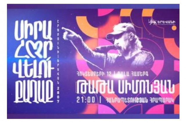 На Площади Республики Еревана 12 октября в 21:00 состоится главное событие торжества «Эребуни-Ереван 2807» – заключительный праздничный концерт, на котором выступит всеми нами любимый артист Тата Симонян. Об этом сообщили в пресс-службе мэрии Еревана. Мероприятие завершится фейерверком.