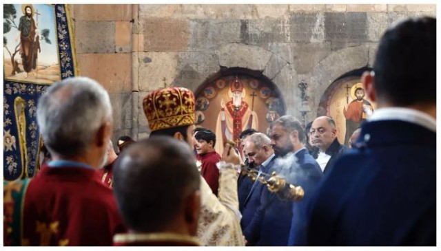 Низложенный дьякон Роберт Агазарян, премьер-министр Никол Пашинян, министры экономики Геворг Папоян и обороны Сурен Папикян во время литургии под предводительством лишенного сана Степана (Арама) Асатряна в Ованаванке (26 октября 2025). Оганаван