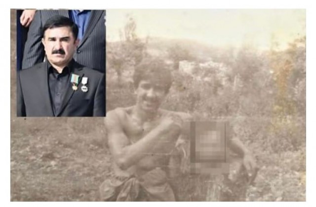 Это Ибад Гусейнов, так называемый «герой» Азербайджана, который 12 июня 1993 года на территории местности Муганлы Мартунинского района убил и обезглавил мирного жителя города Мартуни Рубика Бабаджаняна, а затем позировал с его отрубленной головой. По факту убийства мирного жителя тогда было возбуждено уголовное дело.
