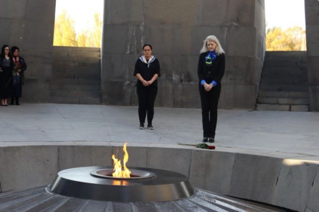 Гостья и сопровождавшие ее лица возложили цветы к Вечному огню, а затем осмотрели мемориальный комплекс. У мемориальной стены они остановились у памятных плит Генри Моргентау, послу США в Константинополе во время Геноцида армян, и Клары Бартон, основательнице Американского Красного Креста.